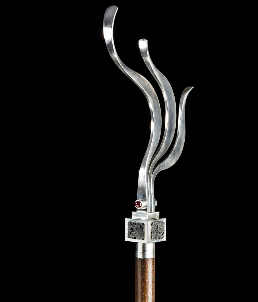 Die Krümme besteht aus einem Quader, in den auf jeder Seite kleine Eisenstücke eingelassen sind. In dem Quader stecken drei einzelne geschmiedete Flammen-Profile, die gemeinsam die Flammen des Heiligen Geistes und die Dreifaltigkeit symbolisieren. Alle Metallteile wurden in Messing gefertigt und anschließend galvanisch versilbert. Der Stiel ist aus Eichenholz. Alle verwendeten Materialien stammen aus Niedersachsen.