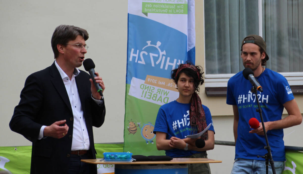 72 Stunden – Uns schickt der Himmel! Unter diesem Motto führen Tausende Jugendliche vom 23. bis 26. Mai eine bundesweite Sozialaktion durch. Die Aktion wurde an mehreren Orten zeitgleich um 17.07 Uhr eröffnet, bei der größte Auftaktveranstaltung auf dem Hildesheimer Domhof sprachen der Oberbürgermeister der Stadt Hildesheim Dr. Ingo Meyer und Weihbischof Heinz-Günter Bongartz.