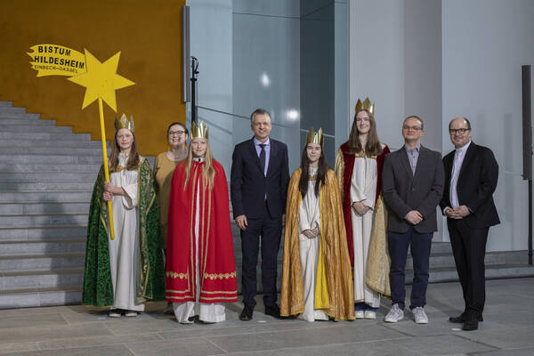 Mit großen Sternen, glänzenden Kronen sind am Dienstagnachmittag 108 Sternsingerinnen und Sternsinger ins Bundeskanzleramt eingezogen. Empfangen wurden sie in Vertretung für Bundeskanzler Friedrich Merz von Minister Thorsten Frei, Chef des Bundeskanzleramts. Für das Bistum Hildesheim waren Lena (17), Edda (16), Lotte (16) und Rugile (14) sowie Begleiter Daniel Weiß aus der Pfarrgemeinde St. Josef in Einbeck und Dassel dabei.