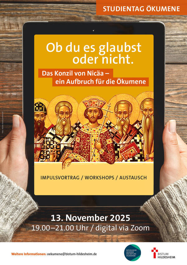 Am Donnerstag, den 13. November 2025, lädt das Bistum Hildesheim von 19 bis 21 Uhr zu einem digitalen Studientag via Zoom ein. Die Veranstaltung steht unter dem Titel „Ob du es glaubst oder nicht. Das Konzil von Nicäa - Ein Aufbruch für die Ökumene“ und richtet sich an alle ökumenisch Interessierten und Engagierten.