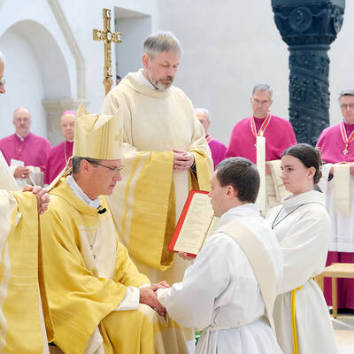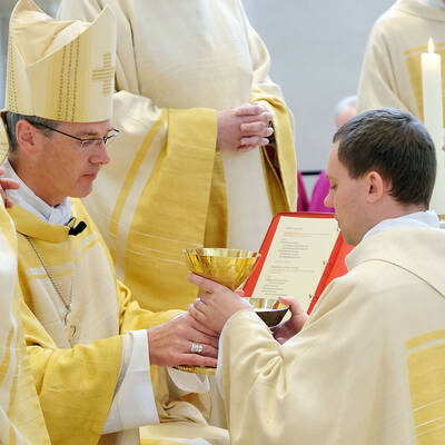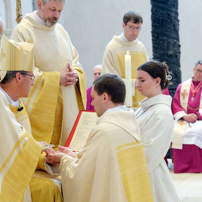 Bischof Dr. Heiner Wilmer SCJ hat am Samstag Dennis Giesa im Hildesheimer Dom zum Priester geweiht.