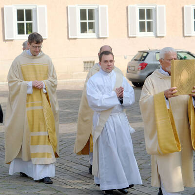 Dennis Giesa, aufgewachsen in Hildesheim-Drispenstedt in der Pfarrei Mariä Lichtmess, hat nach sieben Jahren Ausbildung die Weihe zum Priester erhalten. „Nicht ihr habt mich erwählt, sondern ich habe euch erwählt und dazu bestimmt, dass ihr euch aufmacht und Frucht bringt“, zitierte Bischof Wilmer in seiner Predigt einen Satz Jesu aus dem Johannes-Evangelium. „In der heutigen Zeit kann die Frucht für einen jungen Priester aus meiner Sicht nur lauten: den verwundeten Menschen Hoffnung zu geben“, interpretierte der Bischof das Jesus-Wort. Viele Menschen seien aufgrund unterschiedlichster Ursachen zutiefst verwundete Geschöpfe, sagte Wilmer. Auch die Ereignisse in der Kirche führten zu Verwundungen, so der Bischof.