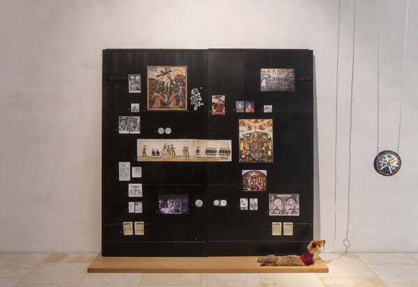 Mit der Anordnung von Reproduktionen historischer Gemälde auf einer schwarzen Metalltür nimmt die Installation Bezug auf den "Mnemosyne-Atlas" von Aby Warburg aus den 1920er Jahren. Die Grafiken thematisieren die Verbreitung von Bildmotiven aus Europa nach Südamerika, die Silbergewinnung in Potosi (Bolivien) sowie die christliche Mission. Dergestalt kontextualisiert sie die seltene Darstellung der ‚Kirche als Spenderin der Sakramente‘ auf dem Gemälde des Wrisberg-Epitaphs (vor 1590) aus dem Hildesheimer Dom mit aktuellen Themen wie Extraktivismus, Ökonomie und Kolonialismus. Das Kunstwerk von Alice Creischer und Andreas Siekmann war Teil der gerade zu Ende gegangenen Ausstellung „Die Zirkulation von Arbeit, Kapital und Leben als Lieferkette“ und wird künftig gegenüber dem Wrisberg-Epitaph präsentiert.