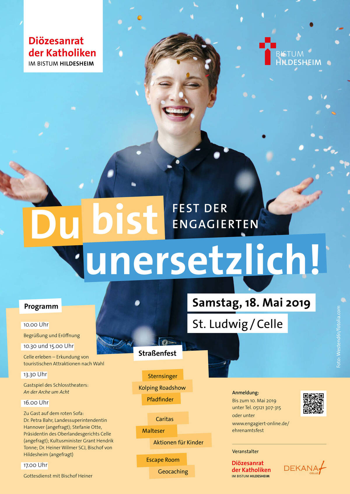 Unter dem Motto „Du bist unersetzlich“ lädt der Diözesanrat der Katholiken im Bistum Hildesheim alle ehrenamtlich Engagierten aus dem Bistum zu einem Fest am Samstag, 18. Mai 2019, nach Celle ein.