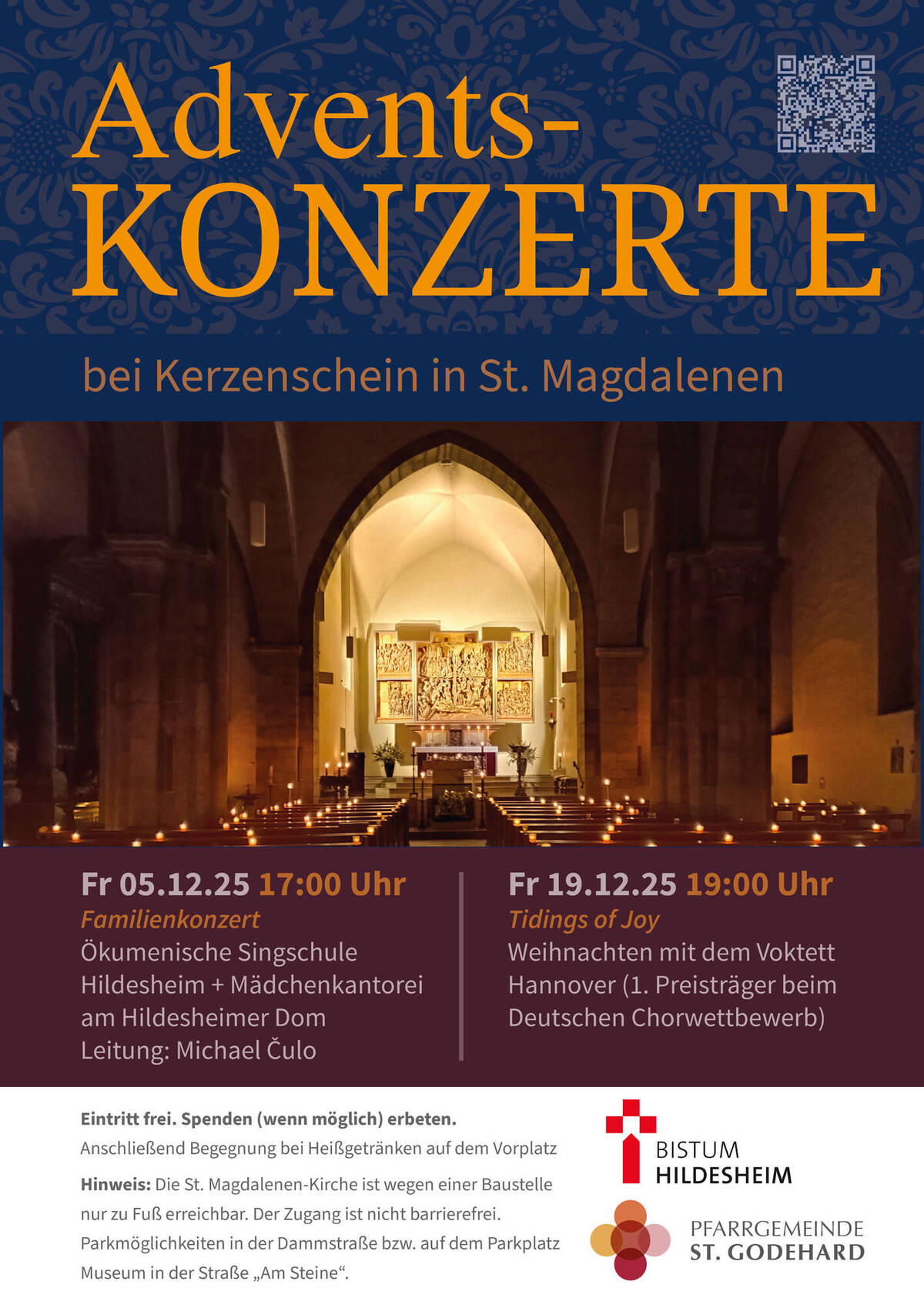 Am Freitag, 5. Dezember 2025, präsentieren die Ökumenische Singschule Hildesheim und die Mädchenkantorei am Hildesheimer Dom in der Kirche St. Magdalenen ein Programm mit adventlich-weihnachtlicher Musik zum Zuhören und Mitsingen. Beginn ist um 17 Uhr.