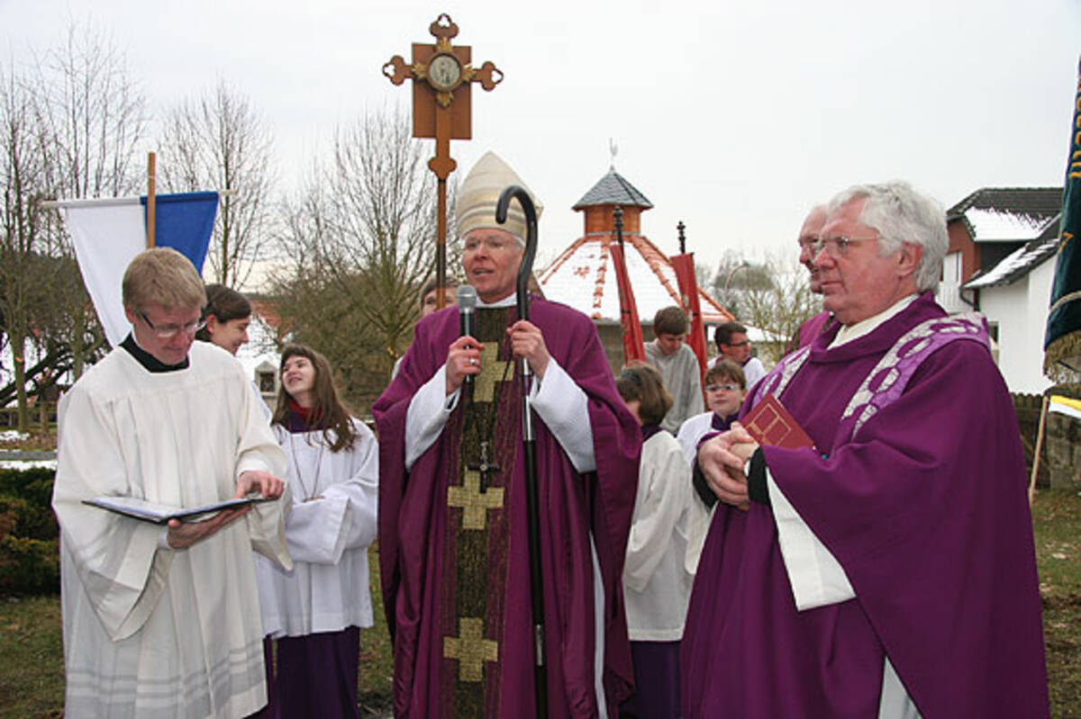 Weihbischof Nikolaus Schwerdtfeger weiht bei der Josefswallfahrt in Renshausen den neuen Kreuzweg ein und schlägt eine Brücke zum neuen Papst