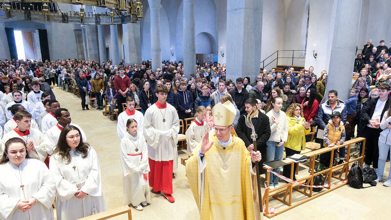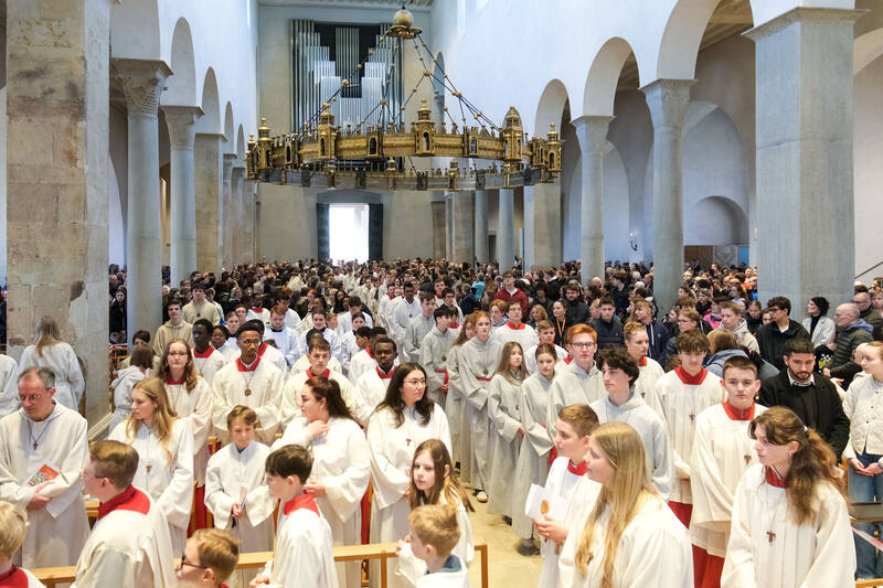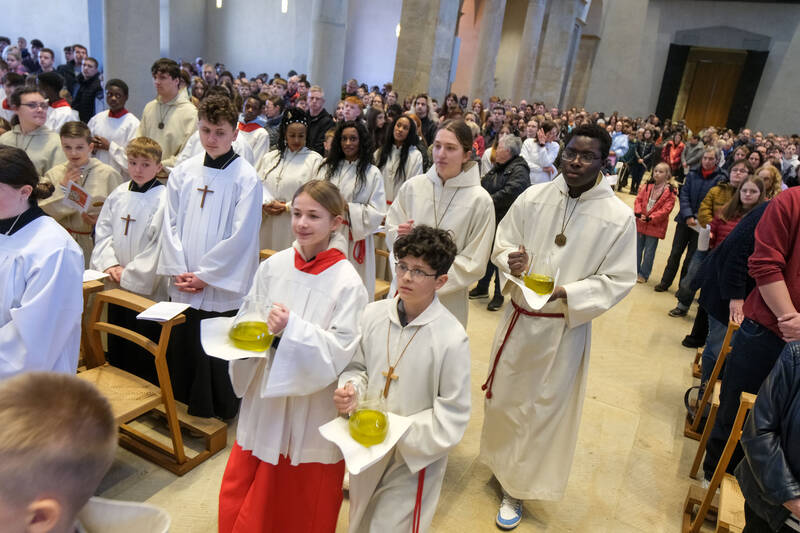 Rund 2.000 Gläubige, darunter knapp 200 Ministrantinnen und Ministranten, haben am Vorabend des Gründonnerstags (1.4.2026) im Hildesheimer Dom gemeinsam mit Bischof Heiner Wilmer die Chrisammesse gefeiert. Zuvor wurde der Domhof zum Treffpunkt für die Jugendlichen.