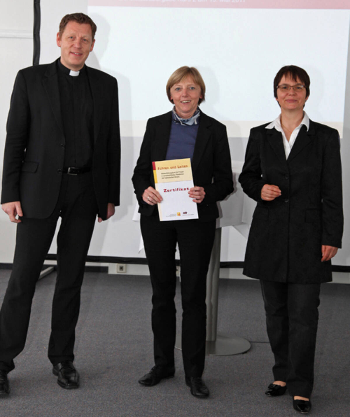 Hildesheim/Bad Honnef (bph) Bettina Syldatk-Kern, Leiterin der Stabsabteilung Recht und Justiziarin im Bischöflichen Generalvikariat Hildesheim, hat erfolgreich die Weiterbildung „Führen und Leiten. Weiterbildung für Frauen in verantwortlichen Positionen der Katholischen Kirche“ der Deutschen Bischofskonferenz (DBK) absolviert. Am 19. Mai konnte sie gemeinsam mit 13 anderen Absolventinnen in der Katholisch-Sozialen Akademie in Bad Honnef ihr Zertifikat entgegen nehmen.