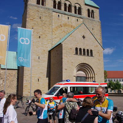 Ganz aufgeben wollten die Malteser ihre Unterstützung aber nicht: So fuhr den Radpilgern schließlich von Tag zu Tag ein Malteserbus voraus, der das Gepäck der Radler transportierte. Für Abendessen und Unterbringung sorgten die Pilger nun selbst, lediglich Frühstück besorgten die Malteser. Und auch sonst so allerlei: Von kleineren geheilten Blessuren und manchen reparierten Seilzügen konnte Thomas Krause, Malteser-Dienststellenleiter in Hildesheim und einer der acht Malteser-Begleiter, schließlich am Domhof erzählen. So ergab sich bei der Ankunft am Hildesheimer Domhof bei Wasser, Bier und Brötchen folgender kurze Dialog: „Ohne Euch hätten wir diese Radpilgertour nie gemacht“, sagte Stefan Branahl, Redakteur der Hildesheimer Kirchenzeitung und einer der Tourleiter, mit Blick auf die Malteser. „Wir ohne Euch auch nicht“, gaben die zurück. „Ohne Euch hätten wir das nie geschafft“, ergänzte schließlich Dechant Thomas Hoffmann aus Wolfsburg und brachte die Dinge damit auf den Punkt.