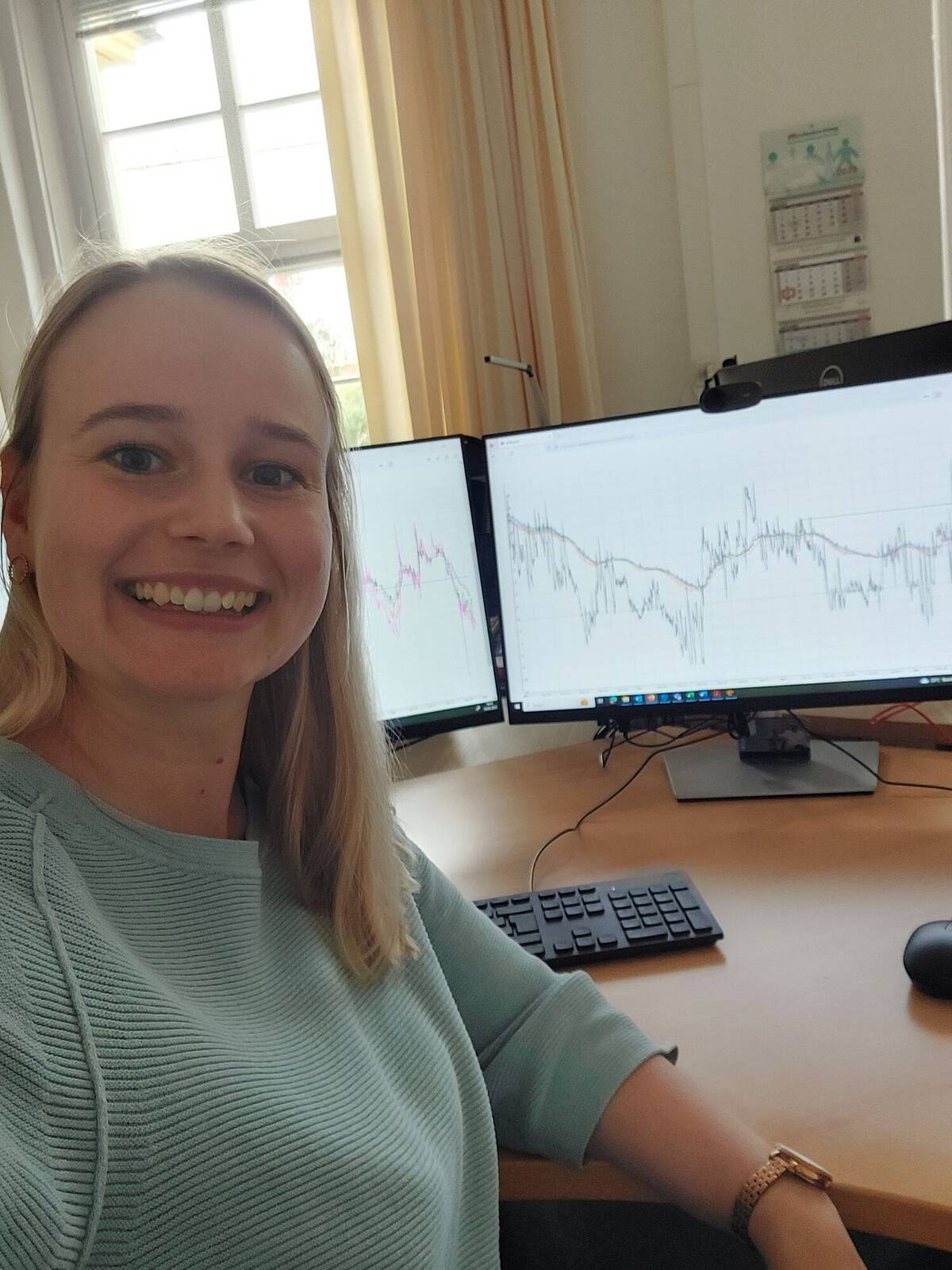 Gebannt starrt Ronja Maatmann auf die zwei Monitore und verfolgt die rosa, blauen oder grünen Linien, die im Zickzack auf- und absteigen. Es sieht hübsch aus – ein bisschen wie ein buntes EKG. Aber hier in der Abteilung Bau des Bischöflichen Generalvikariates werden keine Herzströme dokumentiert. Was ist es also dann? Und was hat das mit Klimaschutz zu tun?