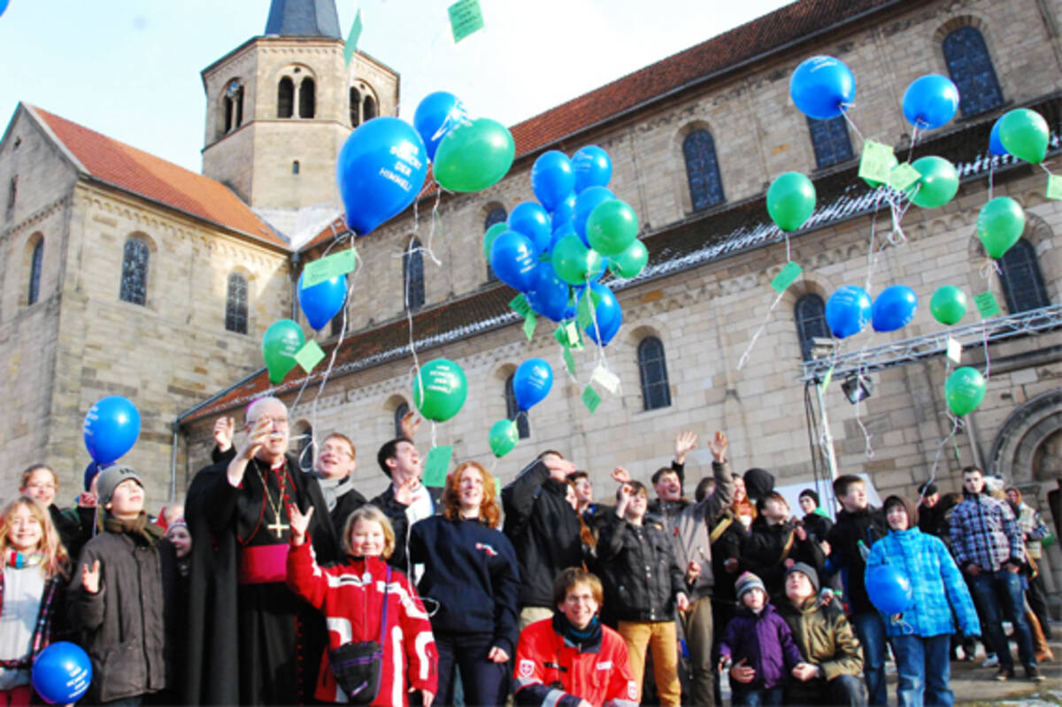 Bereits vor dem Gottesdienst hatte der Bischof die Schirmherrschaft für die 72-Stunden-Aktion der katholischen Jugend im Bistum Hildesheim übernommen. Sie steht unter dem Motto: „Uns schickt der Himmel“. Als symbolischen Auftakt ließen Bischof und Jugendliche hunderte Ballons in den Himmel steigen. Diese Aktion passe gut zum Aufruf „Vergiss die Armen nicht“, so der Bischof. Vom 13. bis 16. Juni sollen Projekte umgesetzt werden, die sonst niemand in Angriff nehmen würde, weil kein Geld da sei oder andere es nicht für nötig hielten. „Da steht ihr voll auf der Linie unseres Papstes, in dem ihr ganz praktisch helft“, lobte Trelle. Bereits bei der Aktion vor fünf Jahren hatte er verschiedene Projekte besucht: Aufbau von Spielgeräten, Baumpflanz- oder Sanierungsarbeiten. „Auch in diesem Jahr werde ich in den drei Tagen der Aktion unterwegs sein und Euch besuchen“, versprach er den Jugendlichen.