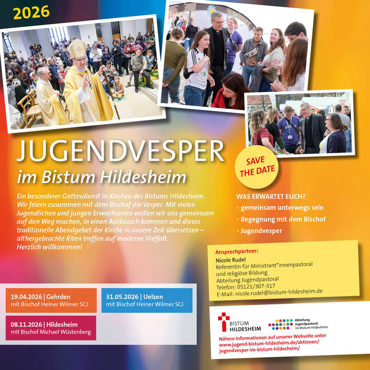 Gemeinsam wollen wir mit Bischof Heiner Wilmer am 31.05.2026 in Uelzen Räume für Begegnung, den Glauben und das eigene Leben öffnen und gemeinsam die Jugendvesper feiern.