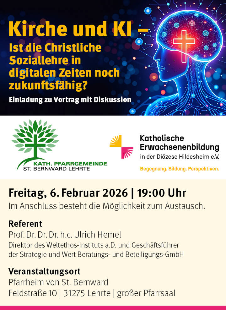 Weitere Informationen zum Vortrag selbst und zum Referenten Prof. Dr. Dr. Ulrich Hemel (Direktor des Weltethos-Instituts a.D. und Geschäftsführer der Strategie und Wert Beratungs- und Beteiligungs-GmbH) finden Sie auf der Website der Pfarrgemeinde St. Bernward.
