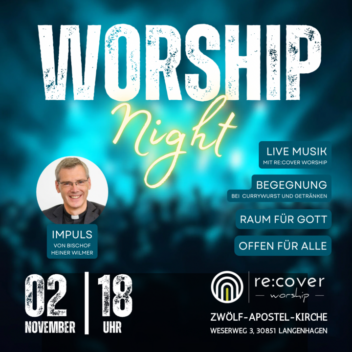 Die Band re:cover.worship lädt am Sonntag, den 02.11.2025 zu moderner Lobpreismusik, Gebet und einem geistlichen Impuls in die Zwölf-Apostel-Kirche in Langenhagen ein. Zu Gast ist dieses Mal Bischof Heiner Wilmer.