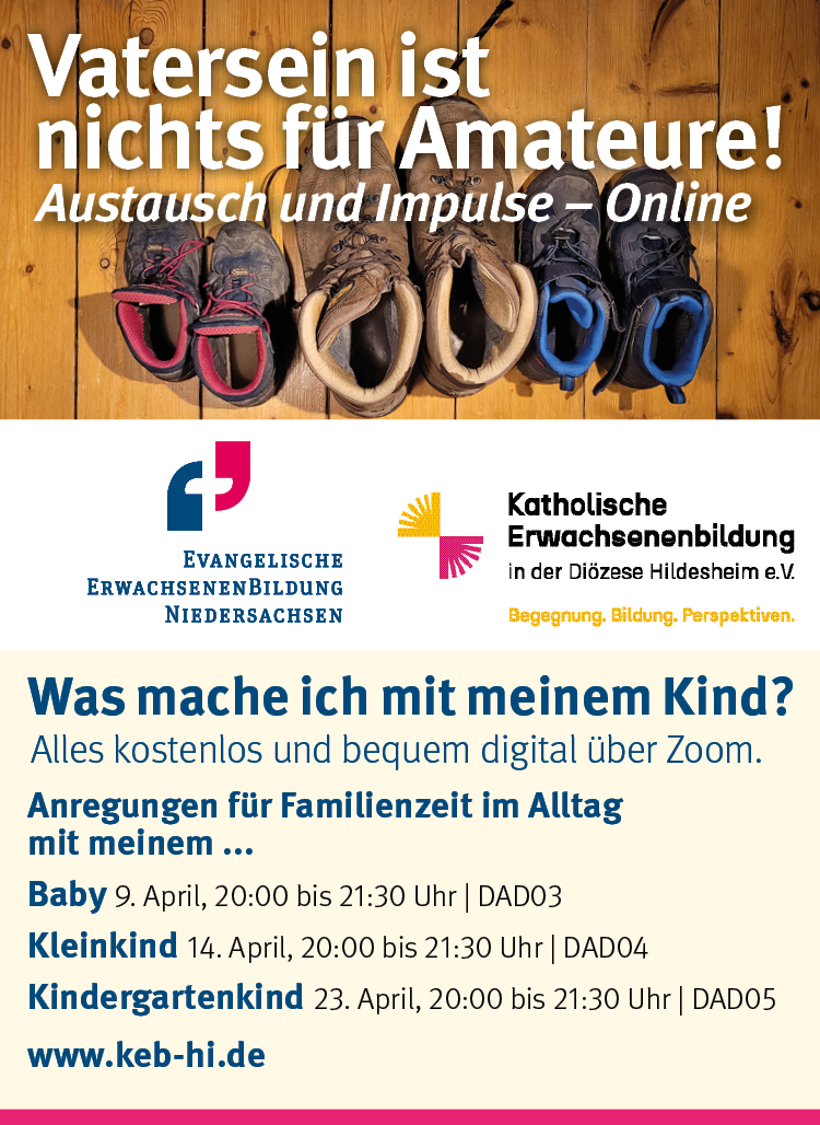 Ein Stereotyp: Wenn es um die ideale Familienkutsche geht, können sich Väter seitenweise durch Material wühlen, beraten lassen und austauschen. Aber in Kursen und Beratungen zum Thema Erziehung sitzen nahezu nur Mütter. Denken Väter, dass man Familie nicht lernen kann? Wir glauben das nicht und wir glauben an Väter. Und deswegen bieten wir: Digitale Impulsen mit bekannten „Väterflüsterern“ und Austauschtreffen an. Jetzt anmelden, der Link kommt ein paar Tage vor der Veranstaltung.