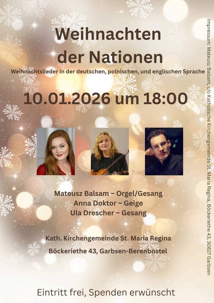 Am Samstag, den 10. Januar 2026, findet in der Kirche St. Maria Regina in Garbsen-Berenbostel um 18.00 Uhr ein internationales Weihnachtskonzert statt.