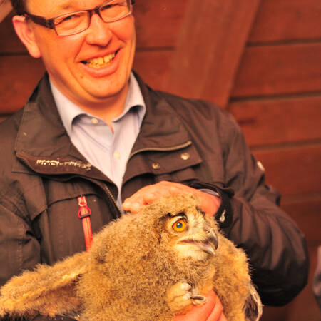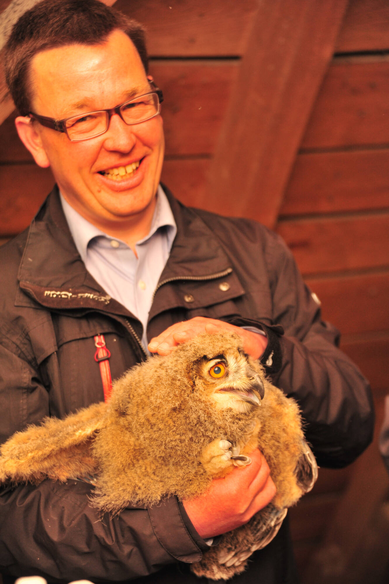Der Umweltbeauftragte Jürgen Selke-Witzel mit einem der Uhus bei der Beringung der Jungvögel.