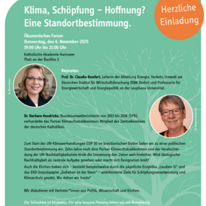 Vor dem Start der 30. Weltklimakonferenz geht es am 6. November in Hannover bei einem ökumenischen Forum um eine politische Standortbestimmung – u.a. mit Prof. Dr. Claudia Kemfert, Abteilungsleiterin am Deutschen Institut für Wirtschaftsforschung (DIW), und der ehemaligen Bundesumweltministerin Dr. Barbara Hendricks ein.