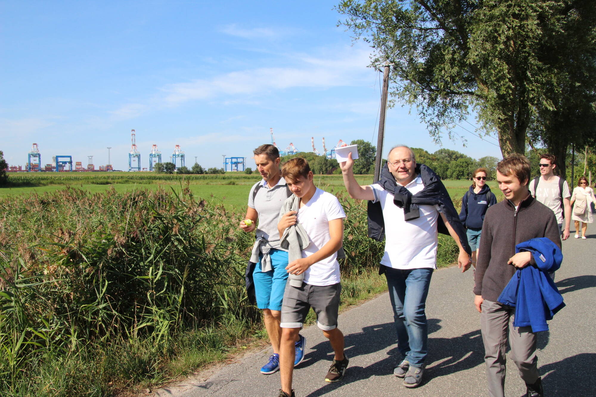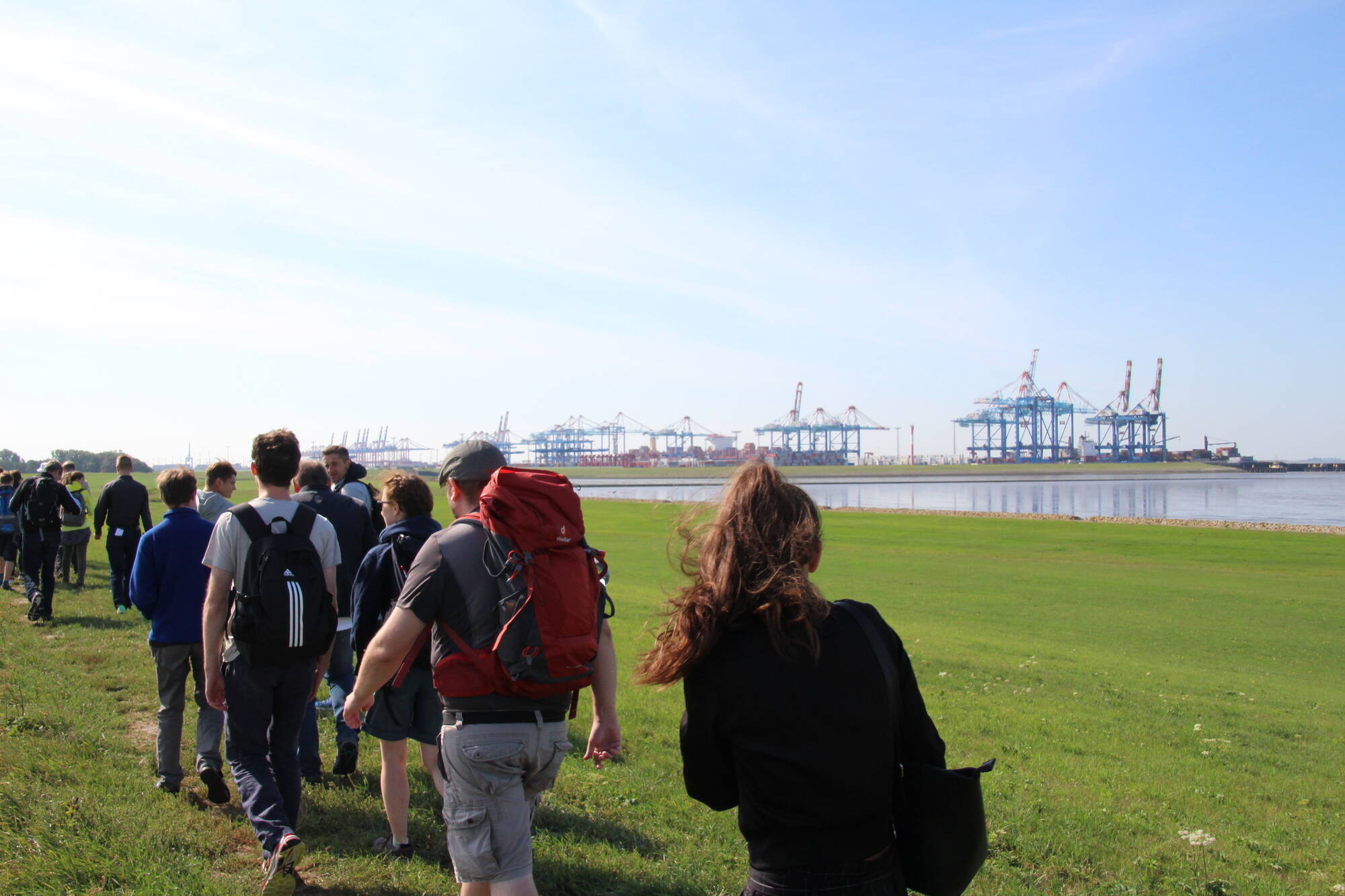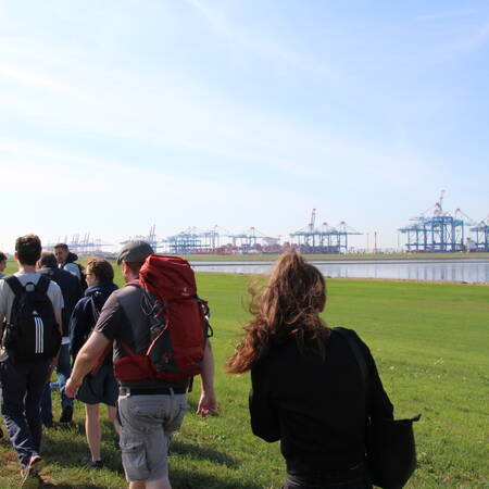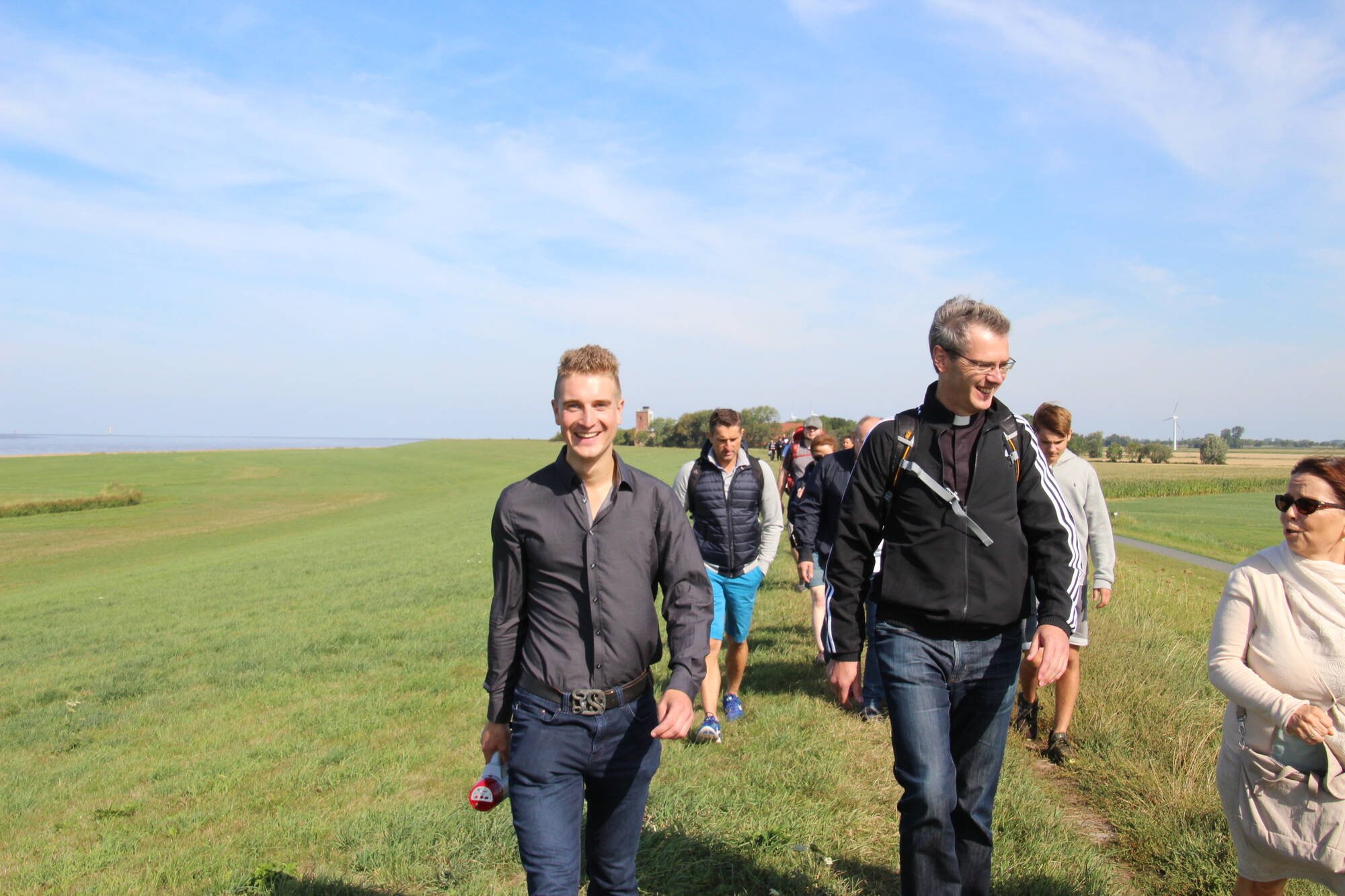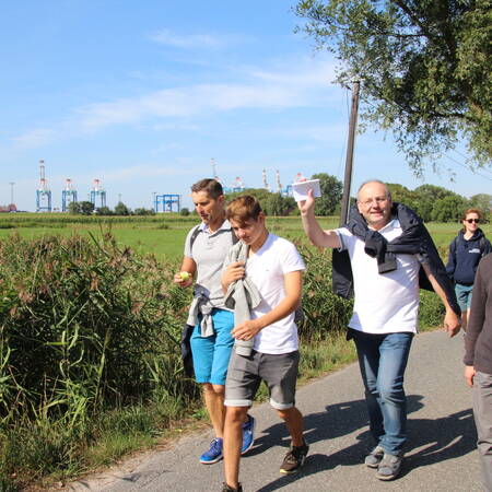Der Startpunkt lag auf dem Deich, mit Blick auf die Kräne des naheliegenden Hafens. Nach zwei Stunden Fußmarsch erreichte die Gruppe den Speckenbütteler Park, wo eine kurze Rast eingelegt wurde. Endstation am Nachmittag war die Kirche St. Marien in Bremerhaven, wo die Teilnehmer nach einem Gottesdienst sich mit einer Pizza stärken konnten.