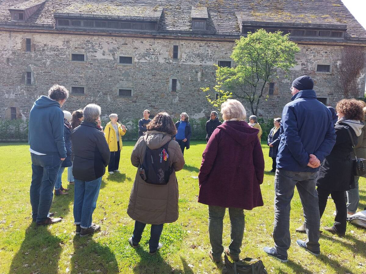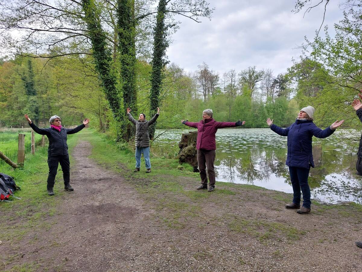 Ich kann mir die Verse und die Bewegungen nicht richtig merken - zu schön ist es gerade hier einfach im Kreis zu stehen: Es ist noch etwas kühl Ende April, aber ich spüre die Wärme der Sonne in meinem Gesicht und auf meinen Händen. Stieglitz und Buchfink singen irgendwo um uns herum und nebenan gluckst das Wasser beim Einfließen in den Klosterteich. „Alles in dir Gott und du im Allem. Die Kräfte des Himmels und der Erde. Wir begrüßen dich, Frühling, mit all deiner Fülle“, dringt es zu mir durch. Und dann bin ich plötzlich doch wieder hellwach, als uns Uwe Habenicht auffordert, nun die Bewegungen allein durchzuführen. Aber meine Sorge ist unbegründet. „Ihr müsst nicht die exakten Bewegungen und Worte kennen. Das passiert von allein. Macht es einfach intuitiv so, wie euch eure eigenen Worte und Bewegungen in den Sinn kommen“, beruhigt uns Habenicht. Und er hat recht. Alles kommt, was kommen sollen und die Bewegungen werden wieder freier und mein Atem wieder ruhiger.