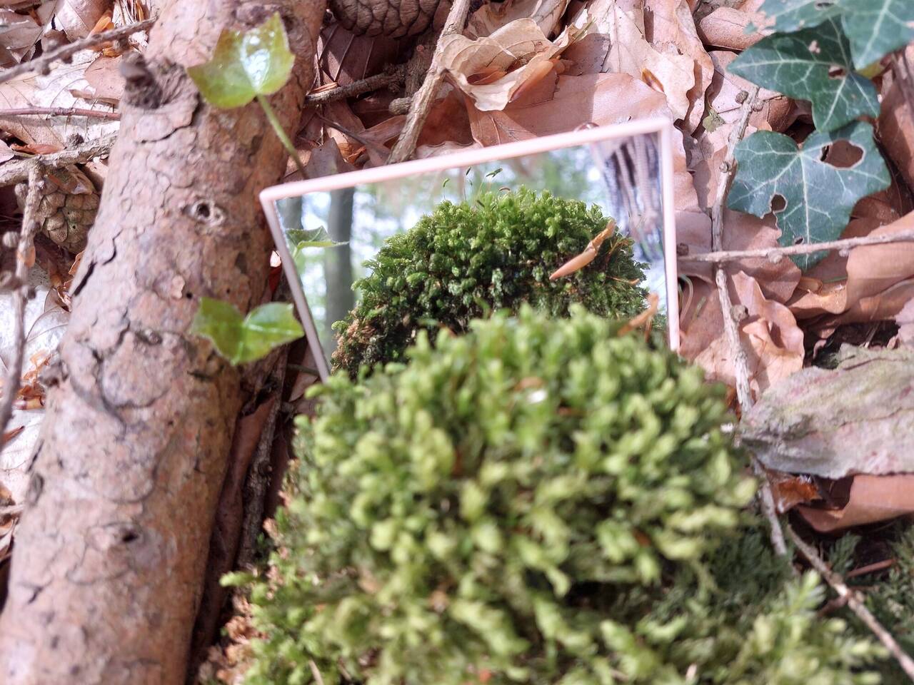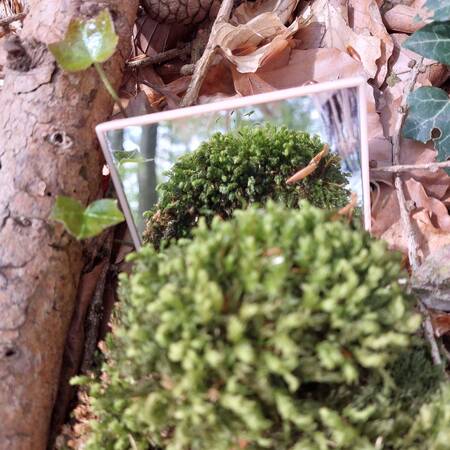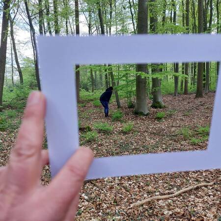 Am nächsten Morgen um neun steht Waldbaden auf dem Programm. „Glaube mir, ich habe es erfahren, du wirst ein Mehreres in den Wäldern finden als in den Büchern: Bäume und Sträucher werden dich lehren, was kein Lehrmeister dir zu hören gibt.“ Mit diesem 1000 Jahre alten Zitat des Zisterzienser Mönches Bernhard von Clairveaux begrüßt uns der Referent Pit Saaler. Er ist evangelischer Pfarrer und zertifizierter Anleiter für Waldbaden. Auch Pit Saaler gibt uns einen Rahmen: Diesmal ist es ein weißes Passepartout, durch das wir den Wald betrachten können. Auch bekommen wir eine Lupe oder einen Spiegel. „Wow“ – ruft einer der Teilnehmenden begeistert, als er mit der Lupe die zerfurchte Rinde eines Nadelbaums betrachtet. „Guck dir das an. Das sieht aus wie eine tiefe Felsspalte, eine Höhle. Da würde ich gerne eintauchen und mich umsehen.“