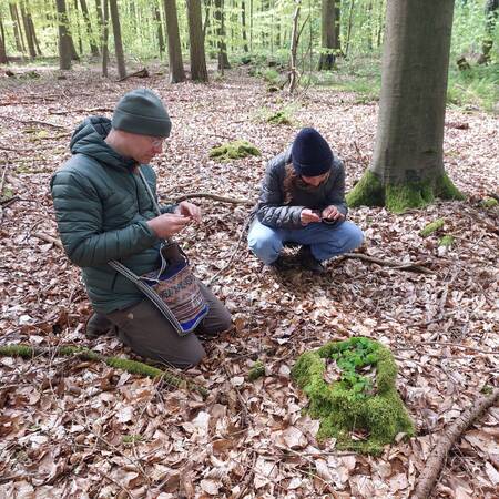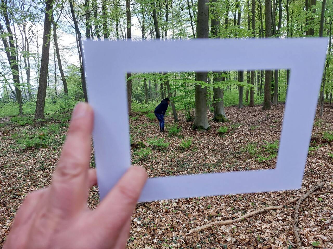 Was der Theologe mit Sharing meint, wird uns klar, als wir an unserem Zielort im Wald ankommen. Über uns wiegen sich die hellgrünen Blätter der Buchen, unter uns ist der weiche Boden mit Blättern aus dem letzten Herbst und frischen Moospolstern bedeckt und ganz in der Nähe klopft ein Specht. Auch hier spannt Uwe Habicht einen Rahmen auf – diesmal aus kleinen Stöckchen auf dem Waldboden. Fast andächtig legen wir unsere gefundenen Grüntöne hinein: Die silbergrünen Härchen am Rand der jungen Buchenblätter, ein gezacktes gelbgrünes Blättchen einer Hainbuche, aber auch die dunkleren, eher blaugrünen Blätter vom Efeu, Ilex oder Buschwindröschen. Während wir unsere gesammelten Schätze hinlegen, teilen wir den andern mit, warum wir diesen Grünton ausgesucht haben oder wiederholen das Gesagte aus der Gruppe. Und mit der Zeit stellt sich ein vertrauensvolles Verbundensein – eine Art Schwarmgefühl ein.