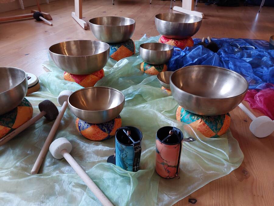 Ich sitze mit einem Teil der Teilnehmenden im Schneidersitz auf dem Boden des Seminarraums im Kloster. Vor uns stehen Klangschalen aus Messing in verschieden Größen – manche so klein wie Dessertschälchen und andere so groß wie Salatschüsseln. Mit filzbezogenen Holzklöppeln schlagen wir vorsichtig gegen unsere Schalen – abwechselnd und dabei immer im Blickkontakt mit den anderen Spielenden und immer lauschend, um genau abzuwägen, wann es wieder passt, in das Klangkonzert einzustimmen. Und nicht zu laut, um die anderen Kursteilnehmenden, die sich mit geschlossenen Augen in unsere Mitte gelegt haben, nur so behutsam zu „betönen“. Zu der Klangreise eingeladen hat die Theologin und Klangtherapeutin Veronika Heid-Lachenmaier. Sie arbeitet selbst regelmäßig mit den Klangschalen und stellt immer wieder fest, wie gut Klang und Vibrationen vielen Menschen tun und wieviel dabei in ihnen in Bewegung kommt. „Ich arbeite auch mit Bewohnerinnen im Hospiz. Und selbst gerade da, erlebe ich, wie gelöst die Menschen nach der Klangtherapie sind.“