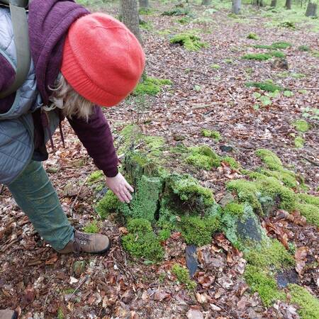 Die Kuckuckspfeife von Inga Kalinowski holt uns nach 10 Minuten wieder zurück und wir berichten uns gegenseitig: Da gibt es einen verfallenden Baumstumpf, der an einen Altar erinnert und mit Flechten und Sternmoos bewachsen ist. Und im Seitenschiff der Kirche müsse man sich unbedingt das Kreuz Jesu angucken, dass aus zwei kaum noch erkennbaren liegenden Ästen besteht. Außerdem gäbe es eine Wildschweinsuhle. „Die sieht aus wie ein Taufbecken. Und es zeigt uns, dass nicht nur Menschen in diese Basilika kommen und an der Liturgie teilnehmen“, berichtet eine Besucherin.