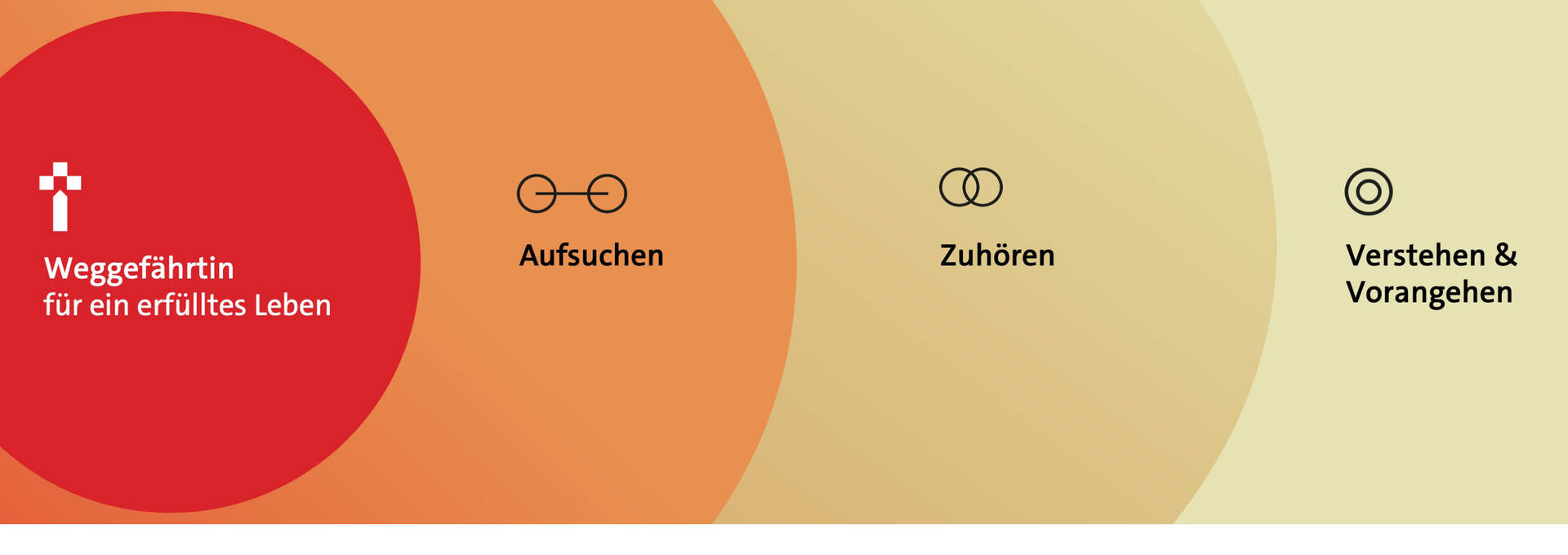 Daher orientieren sich auch die zugrundeliegenden Haltungen an der Emmaus-Erzählung: Aufsuchen, Zuhören, Verstehen und Vorangehen.