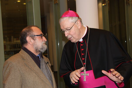 Der Exil-Iraner SAID las am 17. Februar 2010 zum "Aschermittwoch der Künstler" in der Hildesheimer Dombibliothek aus seinem Buch "Psalmen". Im Bild: Der Schriftsteller (links) im angeregten Gespräch mit Bischof Norbert Trelle